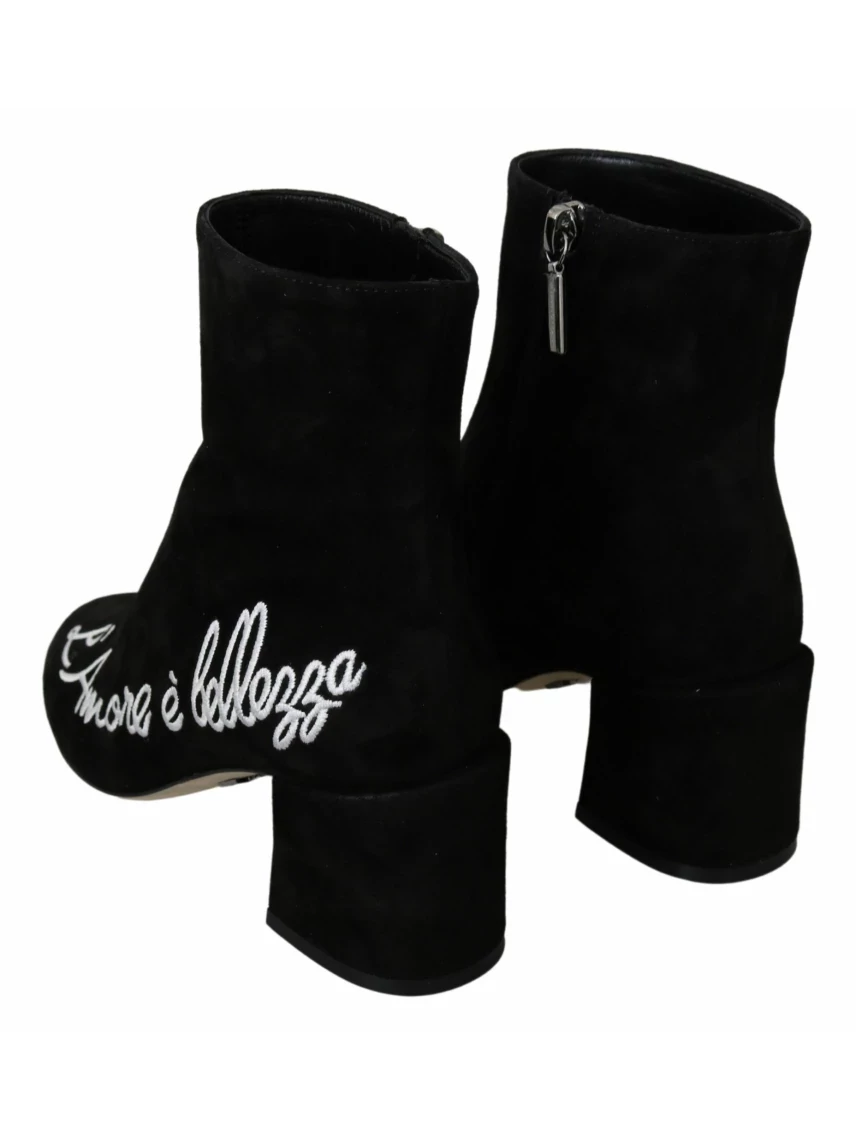 Step into luxury with these stunning black suede ankle boots by Dolce & Gabbana. Perfectly crafted in Italy, they feature exquisite white L’Amore E’Bellezza embroidery, a testament to love and beauty. Set on a pure leather sole, these high-quality boots offer unparalleled comfort and terrific attention to detail with their discreet logo. Dare to stand out with this elegant pair that speaks volumes of your impeccable taste in fashion. Color: Black Material: Suede Sole: Leather Country of origin: Italy