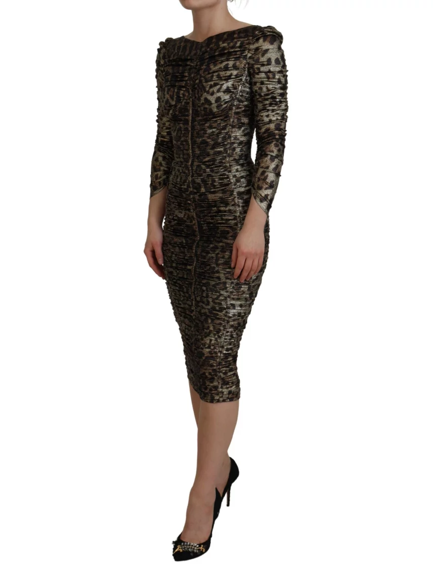 Indulge in the epitome of Italian luxury with this stunning long-sleeved bodycon midi dress from Dolce & Gabbana. Perfect for any sophisticated occasion, this dress boasts a bold multicolor leopard print that’s guaranteed to turn heads. The silhouette celebrates the feminine form with a snug fit and elegant midi length. A zipper closure ensures a seamless look while the sumptuous blend of silk, polyester, and elastane provides a comfortable yet flattering drape. With exquisite craftsmanship and attention to detail, this dress is a true testament to the Dolce & Gabbana legacy of style and elegance. Color: Multicolor Material: 54% Silk, 42% Polyester, 4% Elastane Lining: 49% Cotton, 27% Nylon, 24% Elastane Country of origin: Italy Logo details Made in Italy