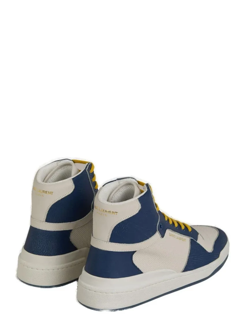 Step up your footwear game with these impeccable, brand new Mid-Top Sneakers from the iconic fashion house Saint Laurent. Delivered complete with original tags, a protective dustbag, and the shoe box to ensure their pristine condition. Crafted with precision in Italy, these sneakers are not only a symbol of luxury but also a testament to timeless style and durability. Color: Blue Material: 100% Calf Leather, 100% Rubber Country of origin: IT Lace-up, round toe, featuring logo prints Exquisite calf leather and durable rubber sole construction
