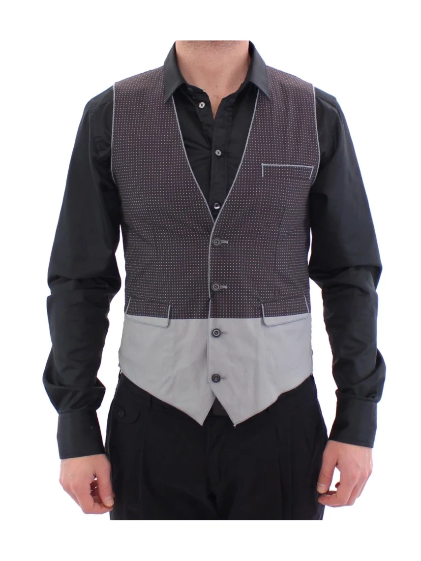 Trasmetti raffinatezza con questo gilet Dolce & Gabbana 100% autentico, fresco di stampa dalla loro esclusiva collezione MainLine. Realizzato in modo impeccabile in Italia, questo gilet è un perfetto mix di stile ed eleganza per il gentiluomo moderno. Il motivo a pois grigi aggiunge un tocco discreto al tuo abbigliamento formale, mentre il cinturino posteriore regolabile e la chiusura con bottoni garantiscono una vestibilità perfetta e confortevole. I bottoni con logo inciso aggiungono un tocco esclusivo del noto lusso Dolce & Gabbana. Che si tratti di un matrimonio, un evento aziendale o un'elegante serata, questo gilet promette di elevare il tuo outfit al massimo livello di classe. Colore: Grigio Materiale: 100% Cotone Paese di origine: IT Cinturino posteriore regolabile Chiusura frontale con bottoni Tre tasche anteriori Dettagli logo