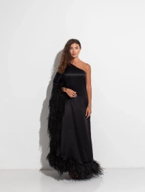 Elegante abito monospalla nero asimmetrico, simbolo di raffinatezza e lusso. Il pezzo forte del modello sono le piume, che aggiungono unicità e un fascino speciale all'abito. Il taglio asimmetrico e i dettagli in piume creano un look dinamico e sorprendente. Una scelta ideale per eventi serali.
