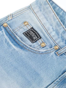 Splendido nuovo di zecca con etichette, 100% Versace Jeans Couture Modello: Versace Jeans Couture denim azzurro chiaro dritto, cinque tasche, logo dorato ricamato sulla tasca posteriore, chiusura frontale con cerniera e bottone Colore: Blu Vestibilità: Dritto Prodotto in: Albany Materiale: Cotone