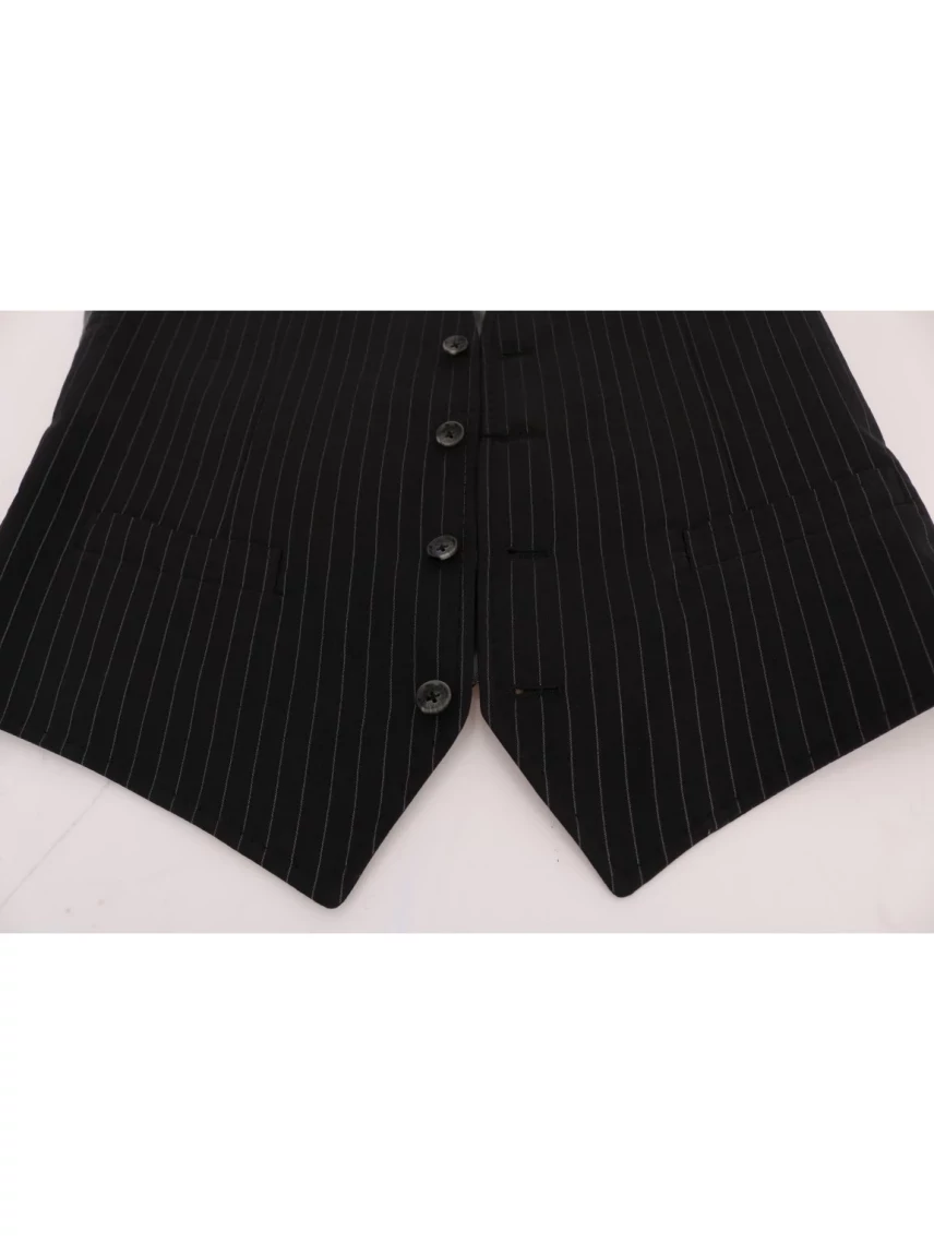 Concedetevi l'epitome della raffinatezza con questo gilet a righe Dolce & Gabbana. Perfetto per i gentiluomini più esigenti che apprezzano l'eleganza sartoriale, questo gilet presenta un elegante design a righe nere, intriso del lusso e dello stile sinonimo del marchio. Con attenzione ai dettagli, dalla chiusura a bottoni alla cintura posteriore regolabile in vita, questo capo è una testimonianza dell'artigianalità italiana. Abbinatelo a una camicia impeccabile e pantaloni sartoriali per un look elegante e formale, oppure indossatelo con un denim per un tocco casual di lusso. Colore: Nero, a righe Materiale: 80% Cotone, 20% Viscosa Fodera: 63% Viscosa, 37% Ottone Prodotto in Italia