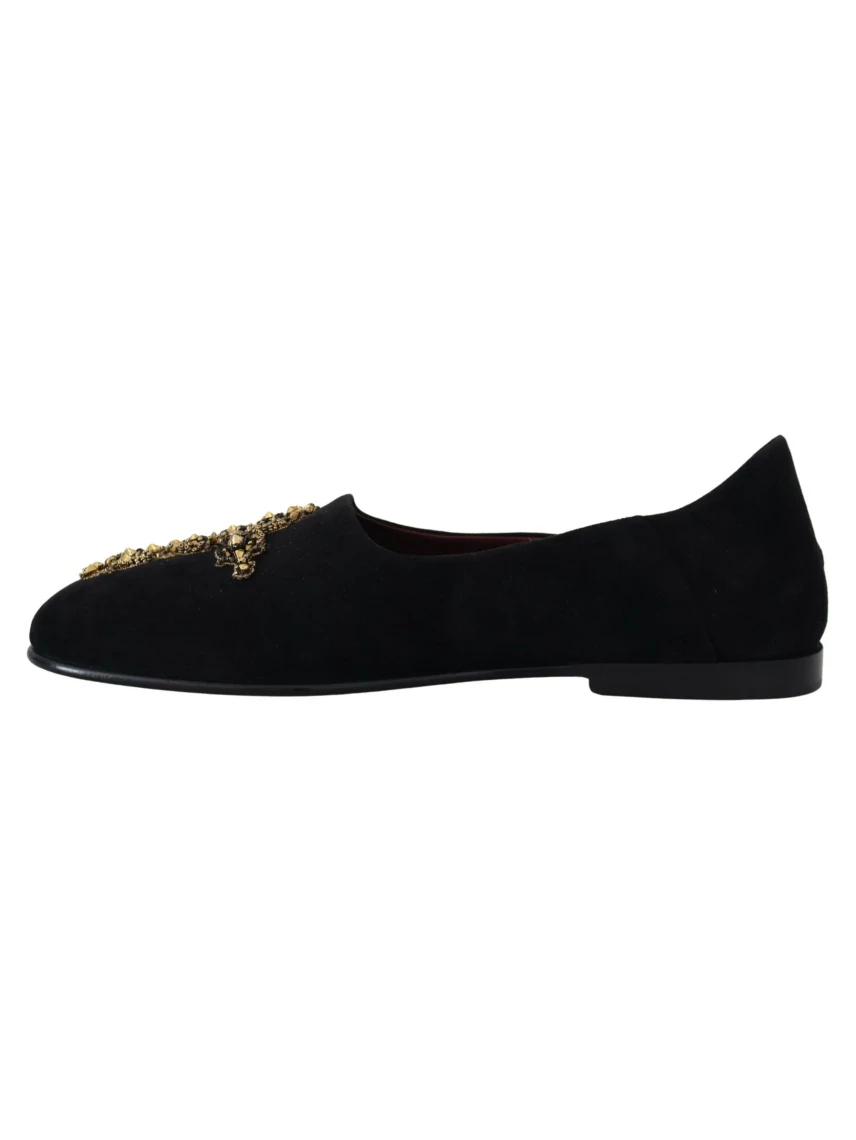 Zanurz się w luksusie tych wsuwanych mokasynów Dolce & Gabbana. Wykonane z dbałością o szczegóły, buty te zachwycają olśniewającym czarno-złotym, zdobionym kryształkami krzyżem na pluszowym zamszu, oferując niezrównany luksus i styl. Idealne dla wymagających dżentelmenów, którzy szukają elegancji i odrobiny splendoru w obuwiu. Kolor: czarny Materiał: 100% zamsz Kraj pochodzenia: SE Szczegóły logo Wyprodukowano we Włoszech